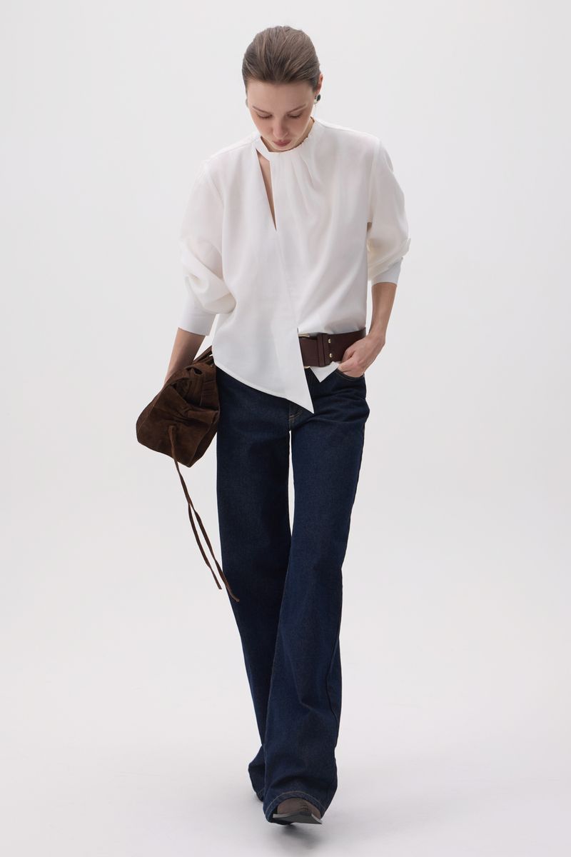 Blusa confeccionada en simil cupro. Detalle de tablas en cuello con sustracción y ruedo asimétrico. Acceso mediante botones en cuello espalda.