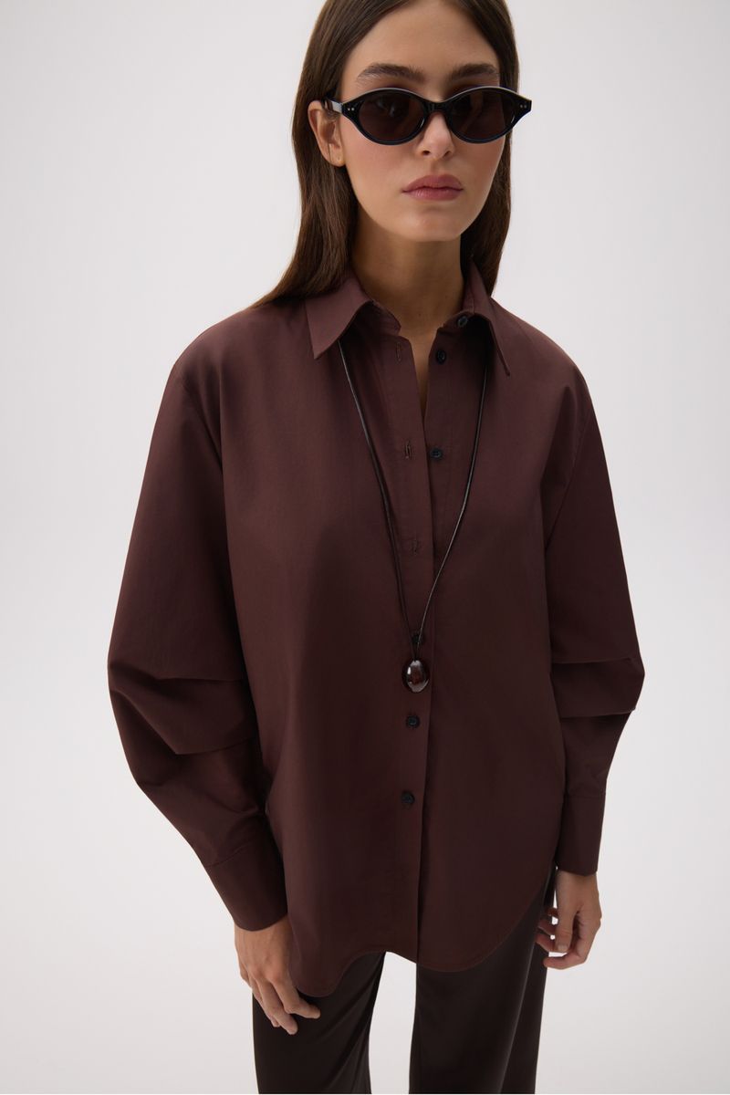 Camisa oversize confeccionada en poplin 100% algodón. Detalle de doble pinza en mangas para generar más volumen.