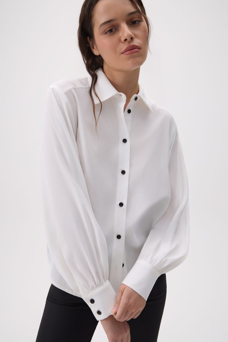 Camisa confeccionada en simil cupro. Detalle de frunce en mangas que produce volumen.