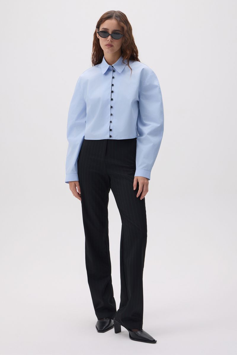 Camisa crop confeccionada en poplin 100% algodón. Detalle de cartera con ojal de cordon con botón. Mangas con volumen tipo balloon y presilla en espalda con medialuna metálica niquel.