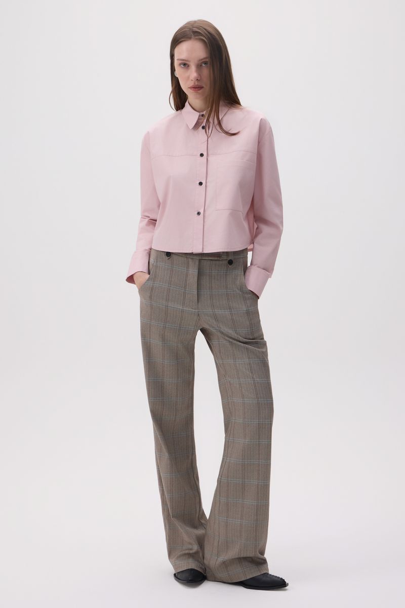 Camisa crop confeccionada en poplin paper touch. Detalle de recorte en delantero y bolsillo plaqué.
