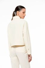 Campera con bolsillo con tapa irregular en delantero y recortes geométricos en delantero y espalda acceso a través de cierre plástico con tiracierre contiene detalle de abertura en puños con cierre invisible forrado largo a la cadera. La modelo mide 1.74 cm. Usa talle 40.