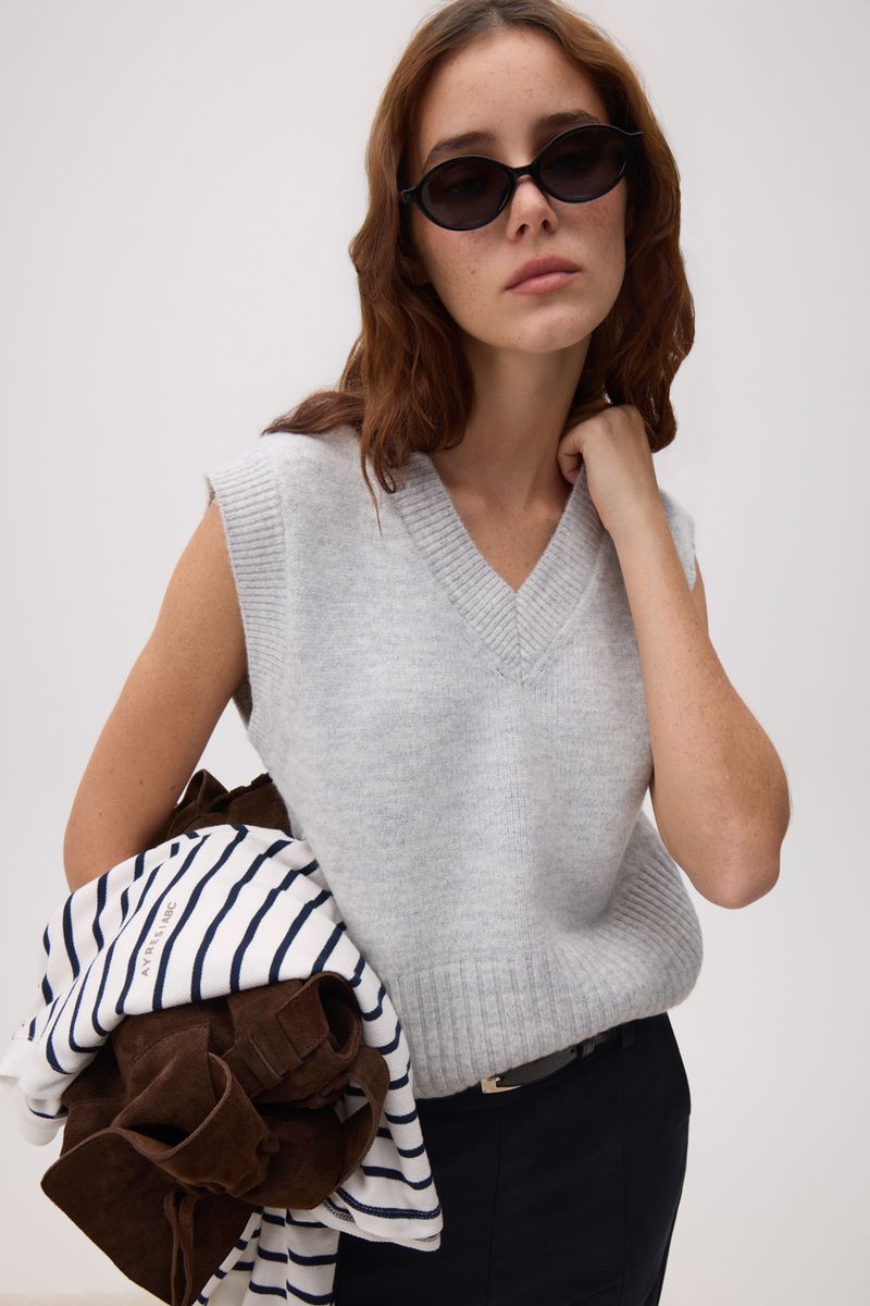 Chaleco escote en v, tejido en jersey con detalle de puños en morley.