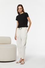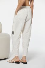 Pantalón jogger confeccionado en textil técnico. Cintura elastizada con detalle de tanca y jareta. Acceso mediante cartera con cierre metálico. Múltiples recortes que esconden bolsillos con cierre invisible. Posee etiqueta de goma pvc en botamanga. La modelo mide 1,74 y usa talle 40.