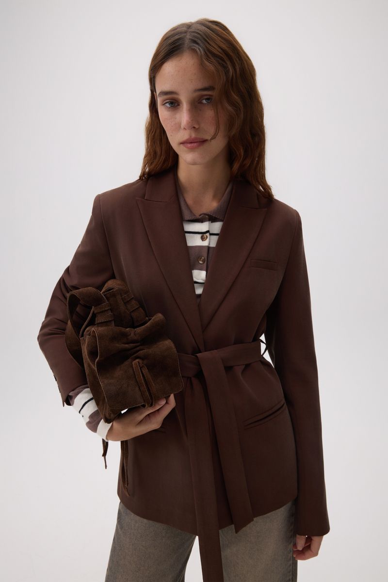 Saco confeccionado en textil sastrero de rayón. Lazo para ajustar en cintura y detalle de presilla con botón soft touch en pasador de espalda.