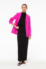Saco sastrero con pinzas de entalle que terminan en bolsillos con tapita en espalda también contiene pinzas de entalle cruce con botón soft touch presenta detalle en mangas de cartera falsa con pespunte rectangular forrado la modelo mide 1.72 cm. Usa talle 38.