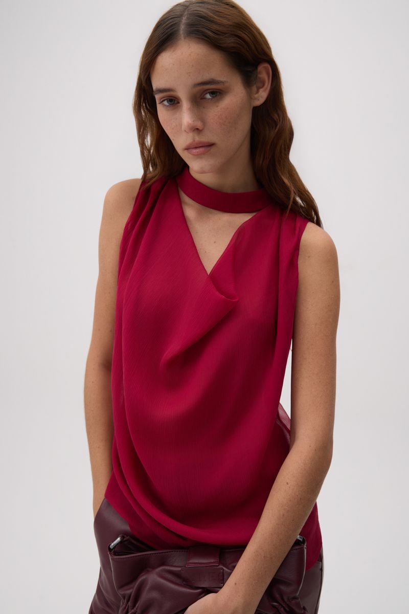 Premium item _ top confeccionado en gasa crinkel 100% seda con buche y cuello. Detalle de pliegues en delantero que generan volumen. Acceso mediante cierre invisible en espalda.