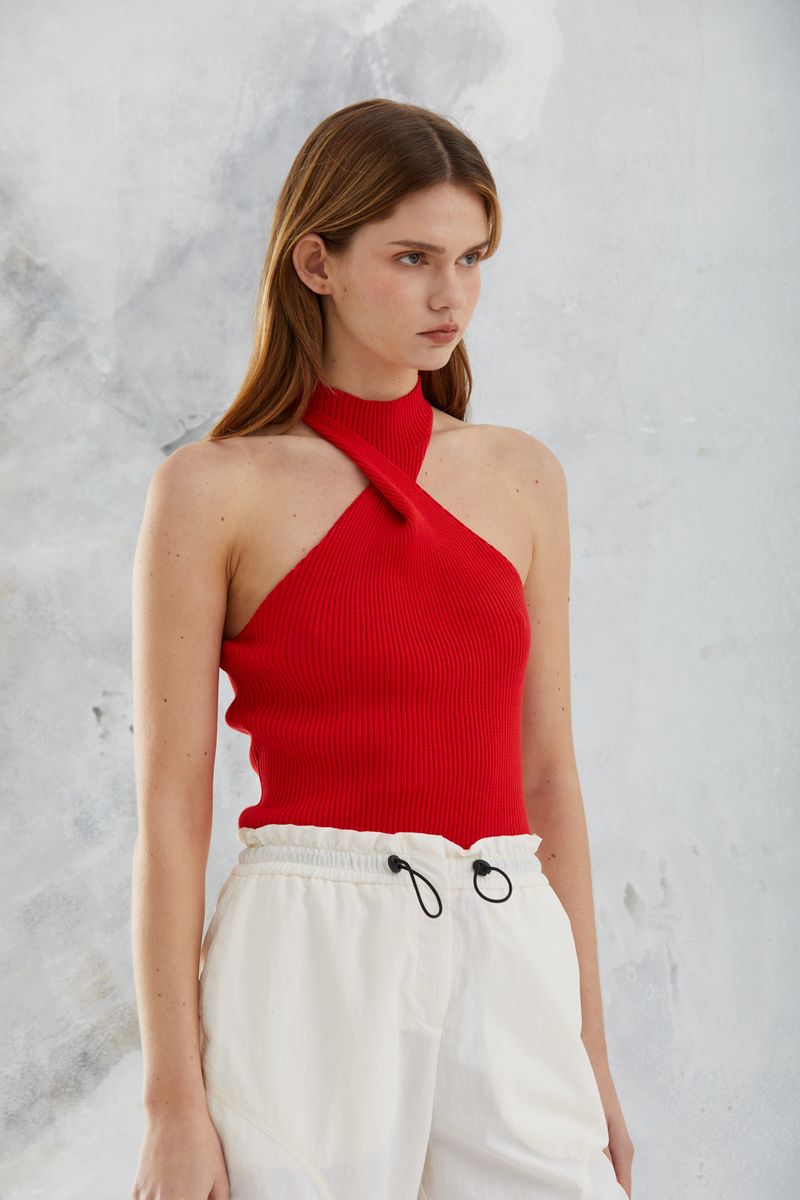 Top con cuello torsionado tejido en viscosa elastizada. La modelo mide 1,78 y usa talle 40.