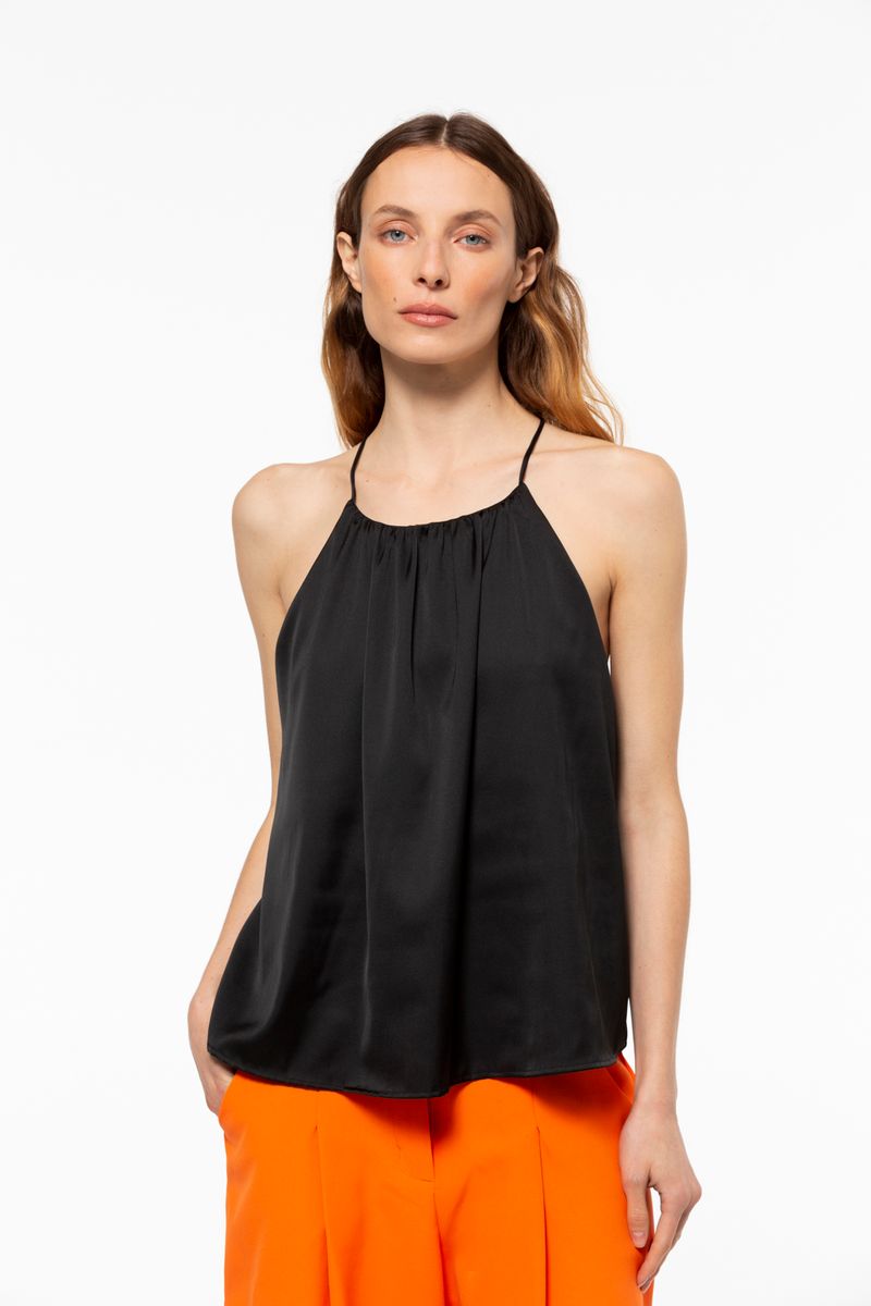 Top de seda satin sin mangas con escote halter con frunces, breteles finitos cruzados y espalda baja con buche dejando ver la espalda al descubierto ruedo con leve forma curvada forrado largo a primera cadera la modelo mide 1.72 cm. Usa talle 38.