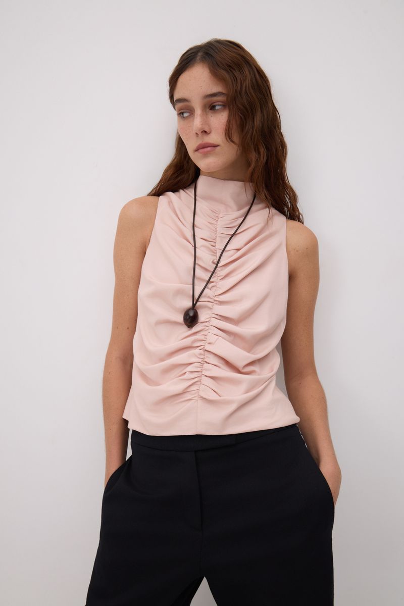 Top confeccionado en textil satinado con detalle de frunce en centro delantero. Acceso mediante cierre invisible en espalda.
