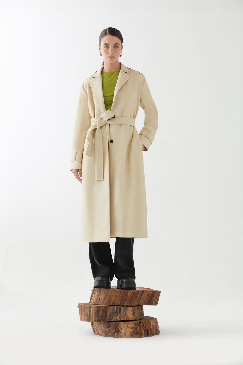 Trench confeccionado en cuero ecológico. Detalle de recortes pisados en frente y dorso, charreteras en hombros y lazo en cintura para dar ajuste. Acceso en delantero mediante botón soft touch personalizado y detalle de tiras en puños que se abrochan a si mismas.