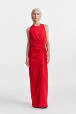 Vestido confeccionado en género asargado satinado, con detalle de nudo que genera frunces y abertura